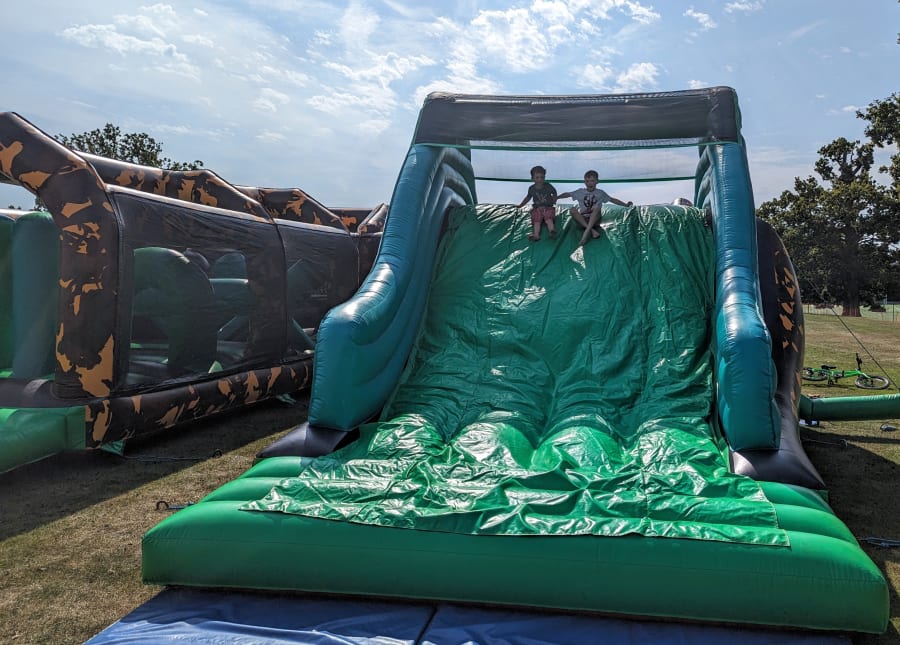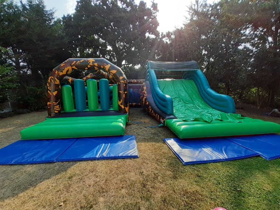 This massive inflatable assault course is designed for big events such as school fetes and company fun days. With a total length of 100ft, it offers the ultimate challenge for those seeking an adrenaline rush! Participants will navigate their way through a series of inflatable obstacles, including crawling tunnels, climbing walls, and slides, all in a thrilling camouflage theme.