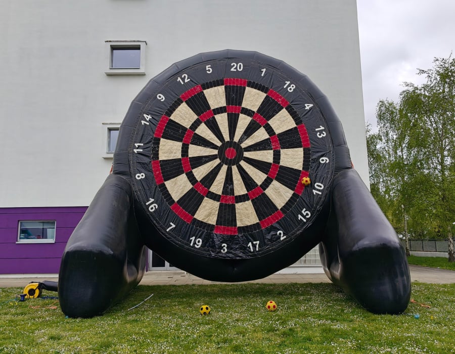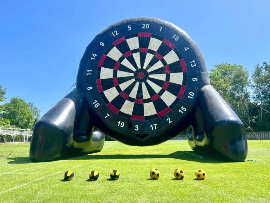 Players take turns to kick the footballs at the dartboard, which stick to it wherever they land. Players earn points by kicking 3 footballs each and totaling the score.